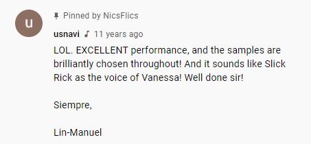 Lin-Manuel Miranda was the first person ever to leave a comment on my youtube channel. He laughed at me and said my girl voice sounded like Uncle Ricky. Best compliment I’ve ever received on my rapping.